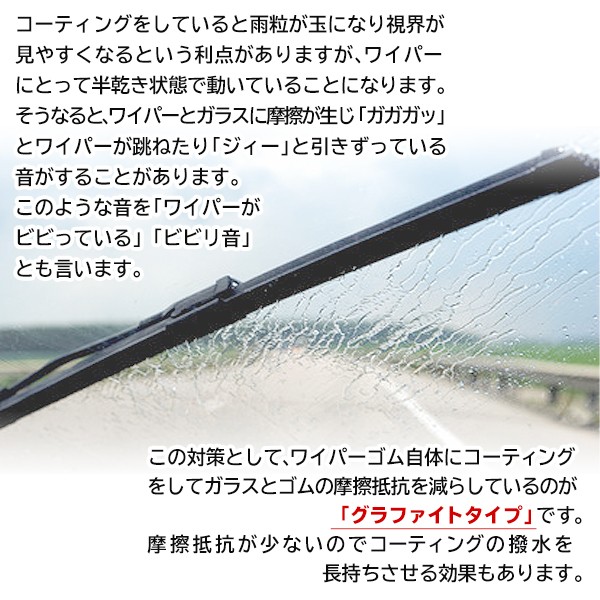 この対策として、ワイパーゴム自体にコーティングをしてガラスとゴムの摩擦抵抗を減らしているのが「グラファイトタイプ」です。