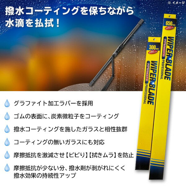 グラファイト加工 選べる長さ30〜65cm ワイパーブレード 撥水コーティングを保ちながら水滴を払拭! 撥水効果を最大限に引き出す! ◆ グラファイト加工ラバーを採用 ◆ ゴムの表面に、炭素微粒子をコーティング ◆ 撥水コーティングを施したガラスと相性抜群! ◆ コーティングの無いガラスにも対応 ◆ 摩擦抵抗を激減させ、【ビビり】【拭きムラ】の発生を防止 ◆ 摩擦抵抗が少ない分、撥水剤が剥がれにくく、 撥水効果の持続性アップ コーティングをしていると雨粒が玉になり視界が見やすくなるという利点がありますが、ワイパーにとって半乾き状態で動いていることになります。