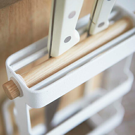 【対応サイズ】まな板:厚み約2.5cm・約1.5cm×各1包丁:刃わたり約20cmまで差し込み口:幅約11.5cmまで刃の厚み:約3mmまで ■スペックデーター■サイズ:約 幅14×奥行12×高さ21.5(cm)材質:本体:スチール(ユニクロメッキ+粉体塗装)バー:天然木ストッパー:シリコン樹脂重量:約 610(g)カラー:ホワイト生産国:中国セット内容:本体、クッション×4、ストッパー×1スチールと木の組み合わせが美しいキッチン収納「トスカ」 包丁&まな板スタンド トスカ ホワイト ●スチールと木の組み合わせが美しい「tosca」の包丁&まな板スタンドです。